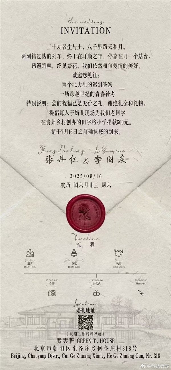 快科技6月21日消息,远比爱还深刻!李国庆与张丹红这场婚礼将于2025年8月16日在北京紫云轩举行,